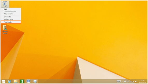 1º Passo- O primeiro passo deste tutorial é abrir o Ambiente de Trabalho a partir do Ecrã Início. Depois cliquem com o botão direito ou façam um toque longo sobre o ícone Reciclagem. No menu de contexto da Reciclagem cliquem ou toquem em Propriedades.