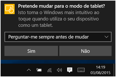 O Windows 10 consegue verificar se estamos a utilizar um rato e teclado ou um ecrã tátil e adapta-se a cada um dos ambientes. Quando ligamos um teclado ao computador surge a seguinte mensagem: