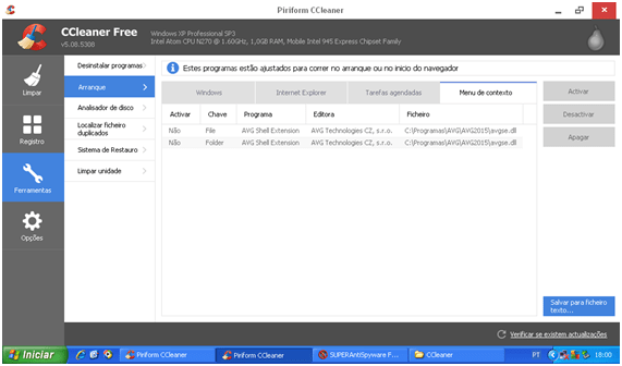 No caso do CCleaner desativei a monotorização do sistema e a ativa para não sobrecarregar o computador e porque eu iria ter contacto com o computador semanalmente e eu próprio iria encarregar-me de executar o CCleaner.