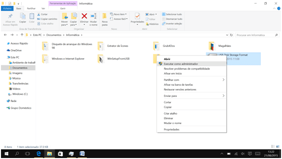 2. Uma vez com a pasta extraída aberta cliquem com o botão direito do rato ou façam ou toque longo sobre o ficheiro USB Disk Storage Format e depois cliquem ou toquem em Executar como administrador.