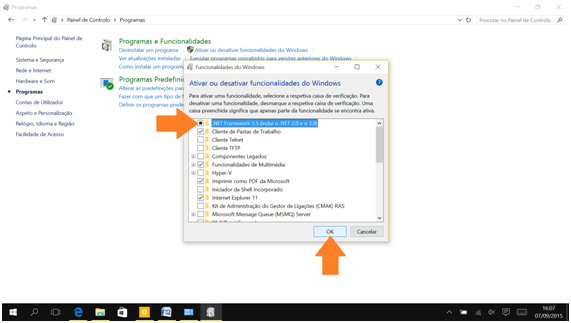 4. Uma janela será aberta com todas as funcionalidades opcionais do Windows. Vamos marcar a caixa .NET Framework 3.5 (inclui o .NET 2.0 e o 3.0) e por fim vamos clicar ou tocar em OK.