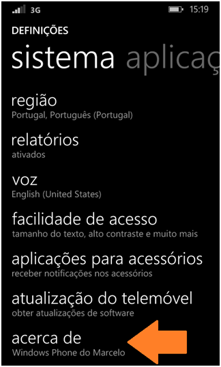 2. Em Definições vamos deslizar até chegar à opção acerca de. Agora vamos tocar nessa mesma opção.