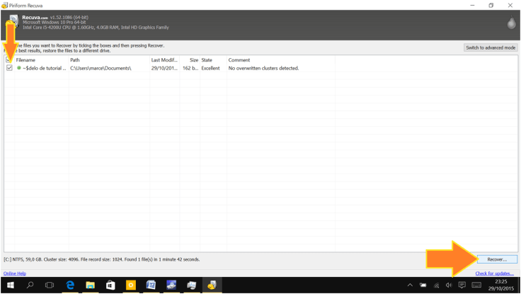 7. Vamos procurar pelo ficheiro que queremos recuperar, selecionar a sua caixa e clicar ou tocar em Recover.