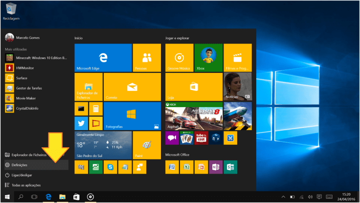 1. O primeiro passo é abrir o menu Iniciar e clicar em Definições.