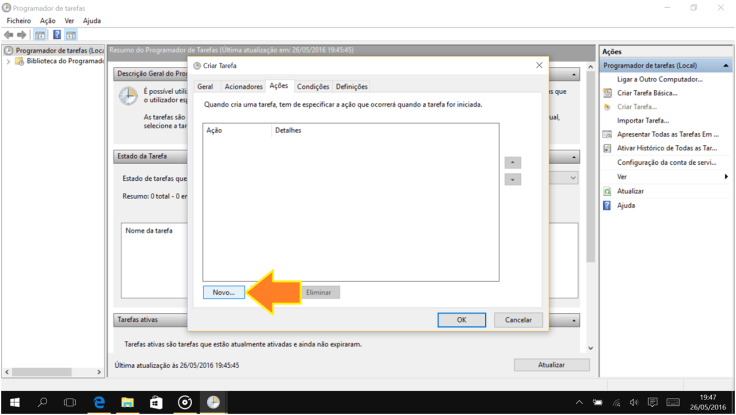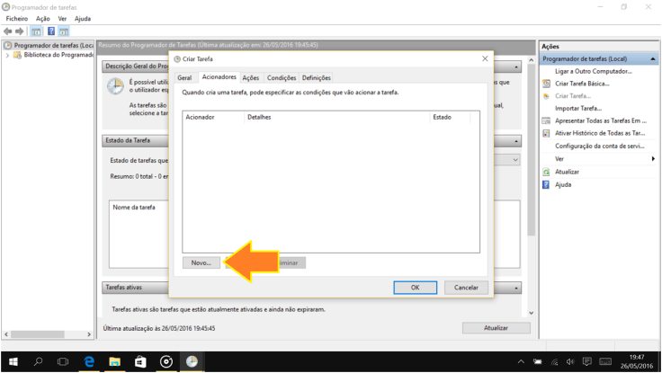 9. Depois no separador Acionadores vamos clicar em Novo…