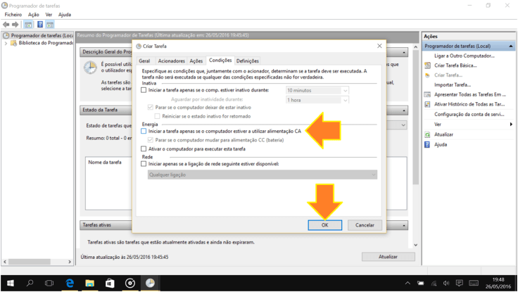 15. Por último vamos clicar no separador Condições e desmarcar a opção Iniciar a tarefa apenas se o computador estiver a utilizar alimentação CA. Vamos clicar agora em OK.