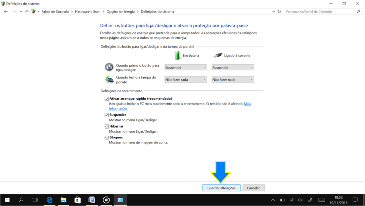 4. As definições anteriormente indisponíveis, estão agora disponíveis e vamos clicar na caixa de confirmação da opção Hibernar e depois em Guardar alterações.