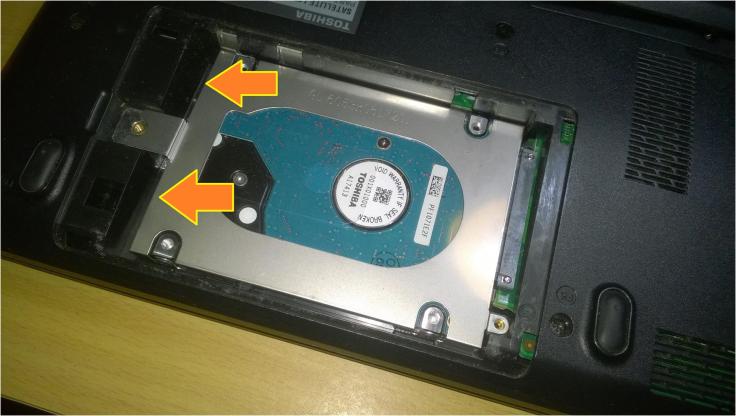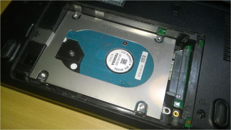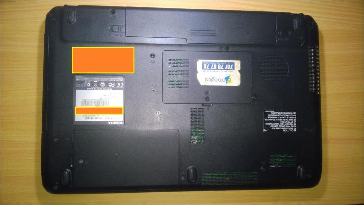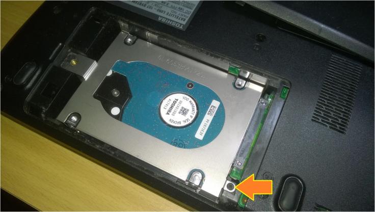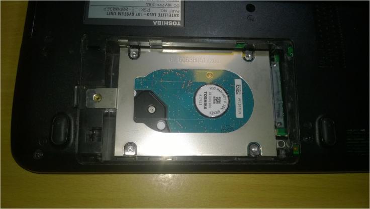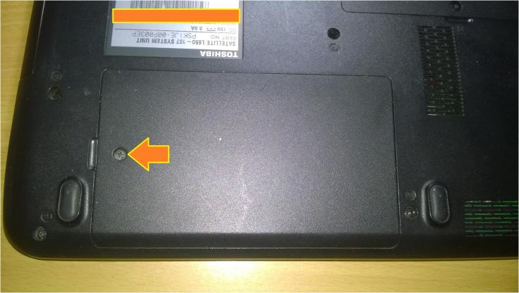 1. O primeiro passo é remover o disco rígido do computador. No meu caso, como vou recuperar os dados de um portátil, Toshiba Satellite L650, é necessário retirar a tampa, na parte de baixo do computador, que permite acesso a ele. Para isso, basta remover um parafuso que segura a mesma tampa.