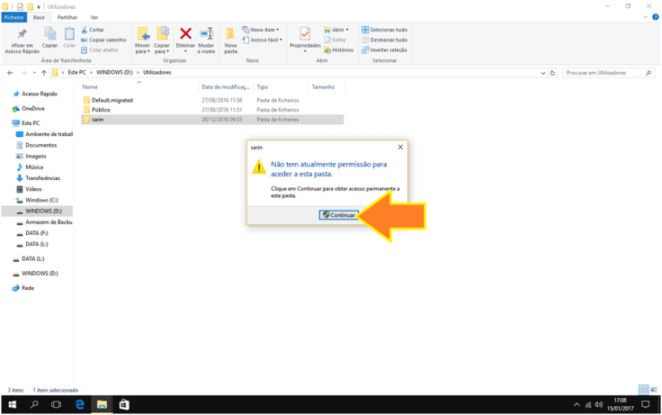7. O Windows irá informar que não temos permissão para aceder à pasta, uma vez que esta pertence a outro utilizador. Vamos clicar em Continuar e esperar para que o Windows nos de permissões para aceder a todos os ficheiros