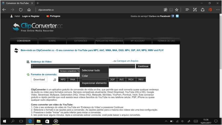4. No campo Endereço de Vídeo: vamos colar o endereço do vídeo que anteriormente copiámos.