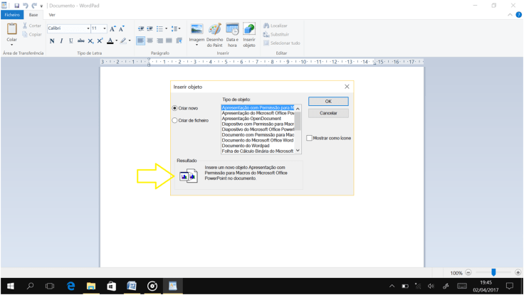 Outro local onde estes ícones vivem é no WordPad, quando usamos a opção Inserir objeto.