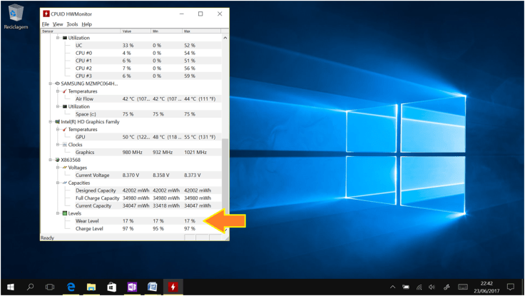 Com o programa aberto, vamos deslizar para baixo, onde se encontram as informações referentes à bateria. De entre os vários parâmetros que são mostrados, é o Wear Level que indica o desgaste da bateria: