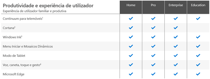 Na categoria Produtividade e experiência de utilizador, todas as edições do Windows têm o mesmo, à exceção do Windows 10 Education que não possui a Cortana.