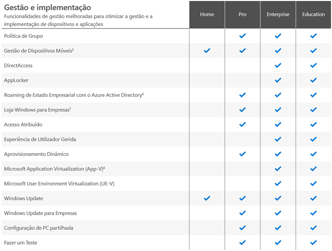 Já em Gestão e implementação, as diferenças aumentam! O Windows Home não conta com funcionalidades como: Política de Grupo, DirectAccess e outras funcionalidades relacionadas com virtualização e empresas. O Windows 10 Pro apenas perde para as edições Enterprise e Education.