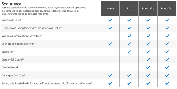 Em termos de Segurança, o Windows não conta com o Windows Information Protection, BitLocker, Credential Guard e Device Guard. Já o Windows 10 Pro apenas não conta com o Device Guard e o Credential Guard. As restantes edições contam com tudo.