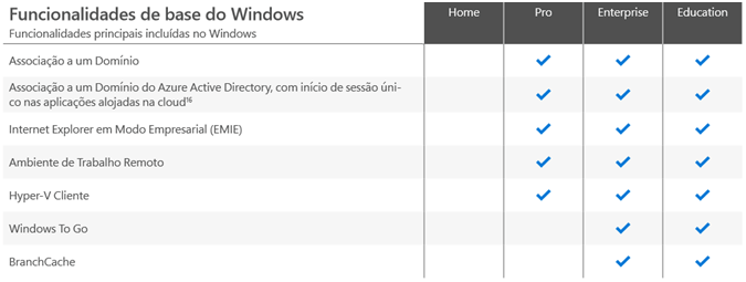Em termos de Funcionalidades de base do Windows, o Windows 10 Enterprise e Education têm tudo. O Windows 10 Pro não conta com o Windows To Go nem o BranchCache. Já o Windows 10 Home não apresenta nenhuma destas funcionalidades.