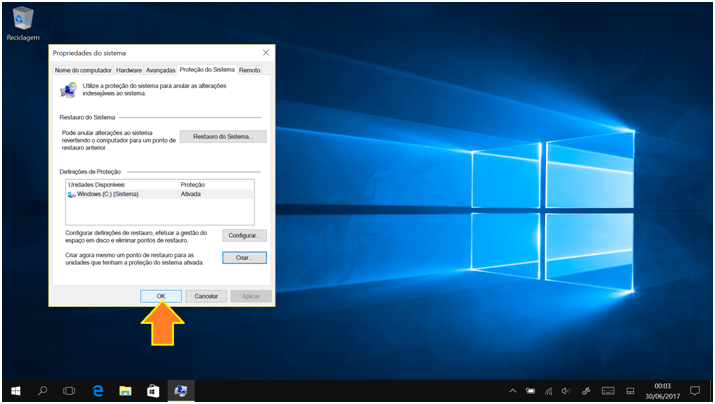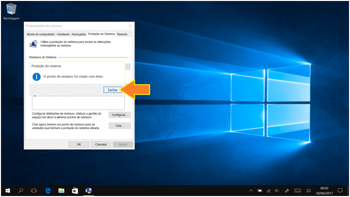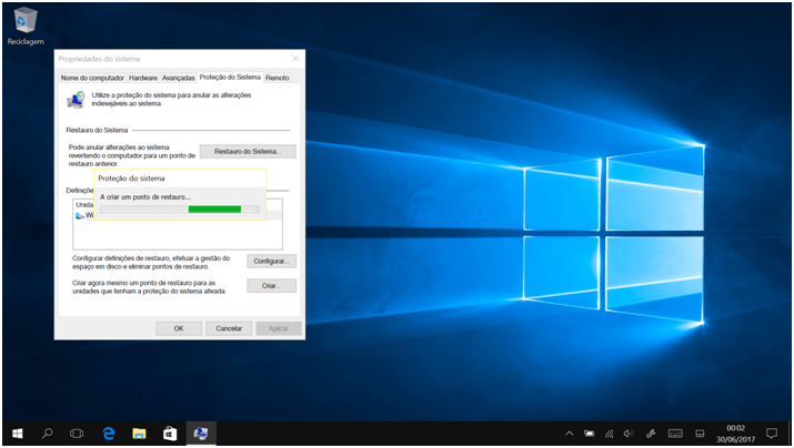 O Windows irá criar o ponto de restauro: