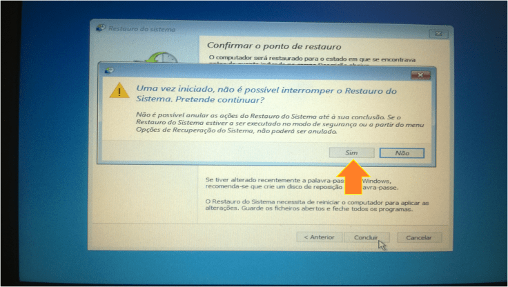 O sistema irá informar que não é possível interromper o restauro se seguirmos em frente. Vamos clicar em Sim.