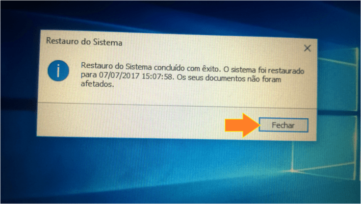 11. Depois de reiniciado, o Windows irá informar que o processo foi concluído com êxito. Basta clicar em Fechar.