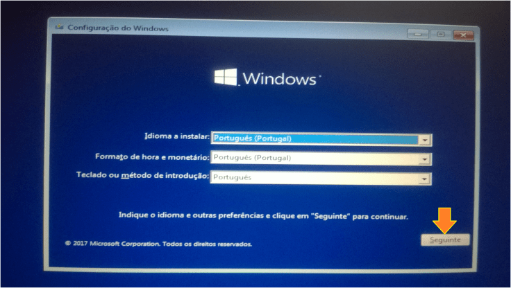 2. A Configuração do Windows irá pedir alguns dados, como idioma e teclado. Depois de selecionados os corretos, vamos clicar em Seguinte.