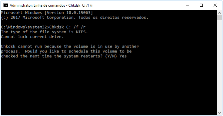 3. Caso tentem corrigir erros na partição do Windows, o Chkdsk vai informar que não pode verificar a partição porque o Windows a está a usar. Assim, pergunta se queremos agendar a verificação para a próxima vez que o sistema ligar. Vamos escrever Yes e clicar na tecla Enter para aceitar.