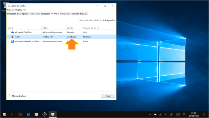 Para retirar um programa do arranque vamos selecionar o programa e clicamos em Desativar.