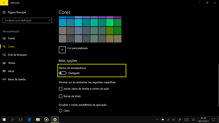 4. Para ativar a transparência do Fluent Design, vamos selecionar a opção Efeitos de Transparência.