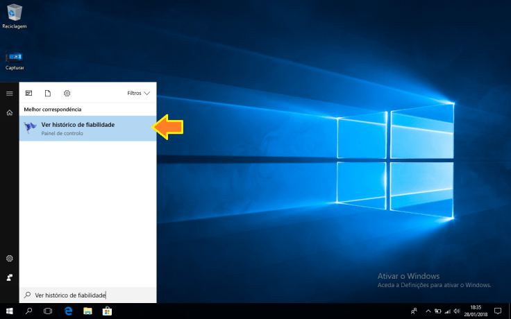 2. Nele vamos procurar por Ver histórico de fiabilidade e clicar no primeiro resultado.
