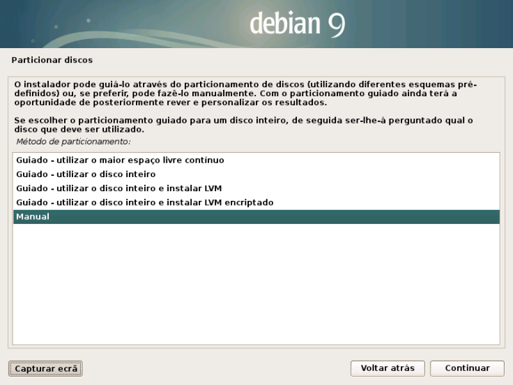 No meu caso, e como vou fazer dual boot, vou escolher Manual.