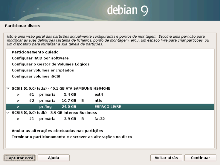 16. Neste ecrã, vou escolher a partição ESPAÇO LIVRE (que não está definida) e clicar em Continuar.