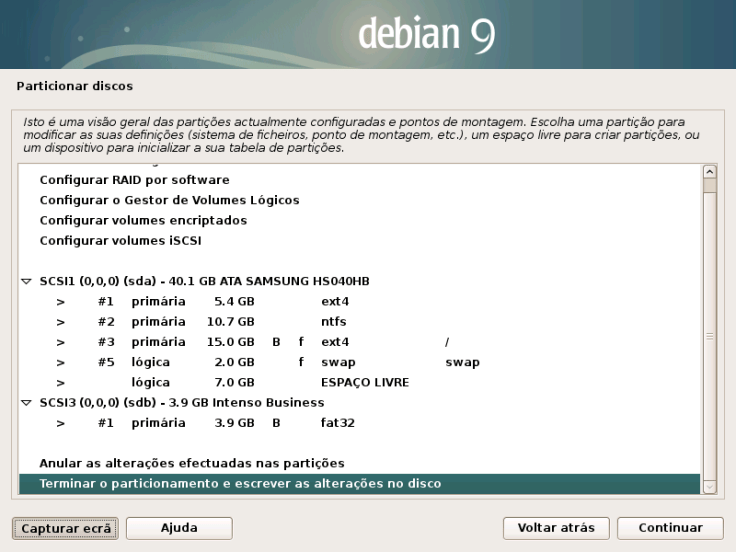 22. Vamos clicar em Terminar o particionamento e escrever as alterações no disco.