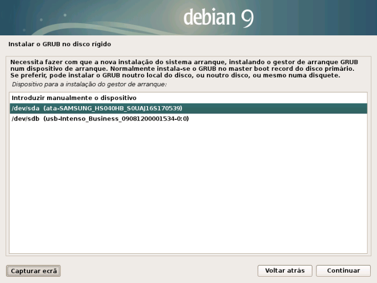 Vamos indicar o disco onde estará instalado o Debian:
