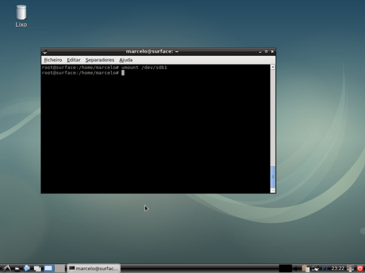 Para desmontar, vamos executar o comando: umount Sistema_de_ficheiros_da_pen