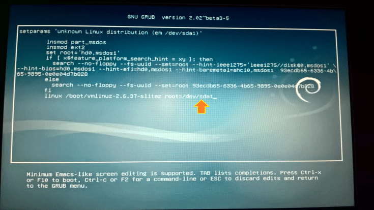 2. Agora, vamos alterar a última linha do código BASH apresentado. Onde se lê /dev/sda1 vamos alterar para /dev/hda1