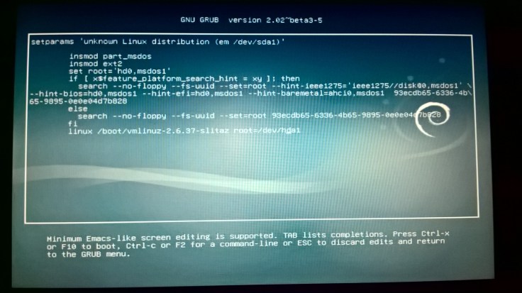 1. O primeiro passo é alterar uma configuração do GRUB. Para isso, vamos, no GRUB, selecionar o Slitaz e clicar na tecla E. Isto irá levar-nos ao modo de edição.