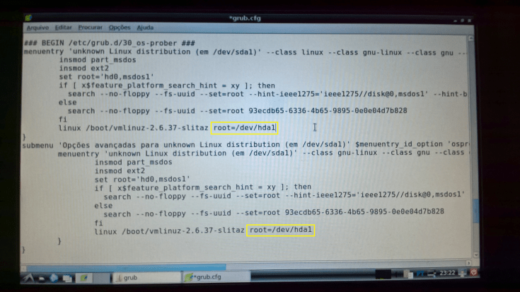 Caso o Slitaz seja o vosso único sistema operativo, façam login como root, abram o ficheiro /boot/grub/menu.lst e alterem-no tal como fizemos acima. No final, guardem-no e já está, problema resolvido!
