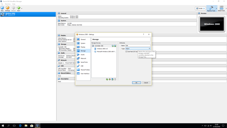 1. O primeiro passo é abrir o VirtualBox, clicar com o botão direito na máquina virtual com o Windows 2000 e clicar em Settings. Depois, vamos clicar em Storage e verifica o campo Type. No meu caso, é do tipo PIIX4.