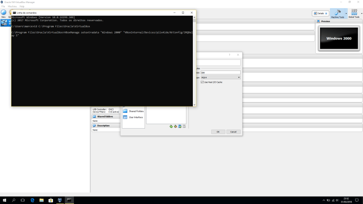 No meu caso, o comando ficou: VBoxManage setextradata “Windows 2000” “VirtualBoxInternal/Devices/piix4ide/0/Config/IRQDelay 5“