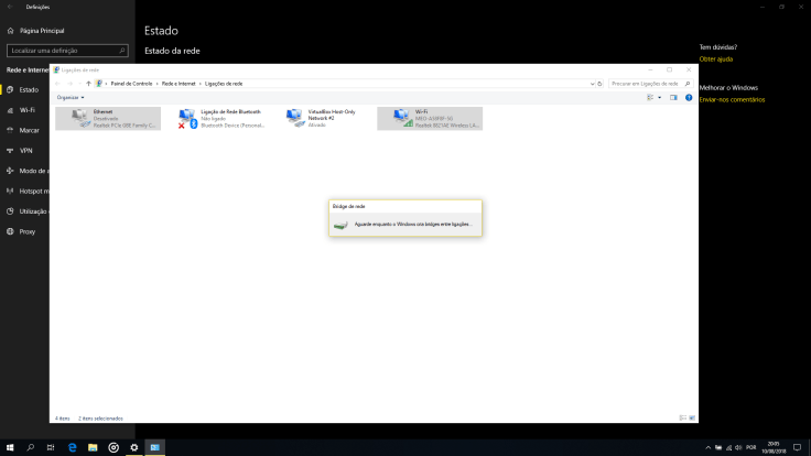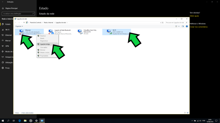4. Vamos selecionar a ligação ativa de Wi-Fi e a interface Ethernet. Depois, com o botão direito vamos abrir o menu de contexto e clicar em Ligações bridge.
