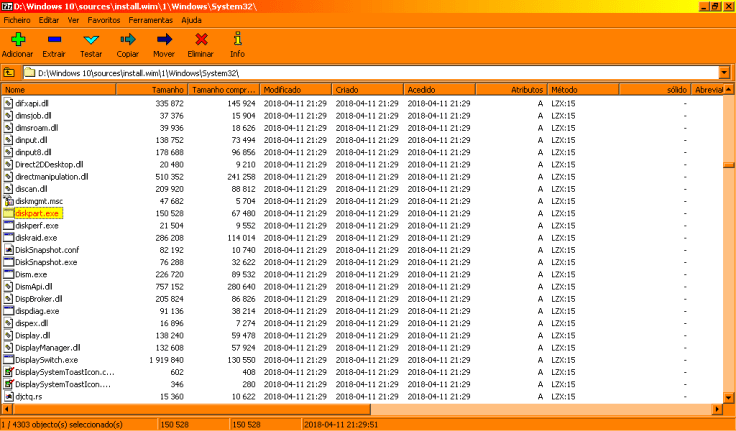 Como o Diskpart corre da Linha de comandos, este está na pasta system32. Assim, naveguei até essa pasta no 7-Zip.