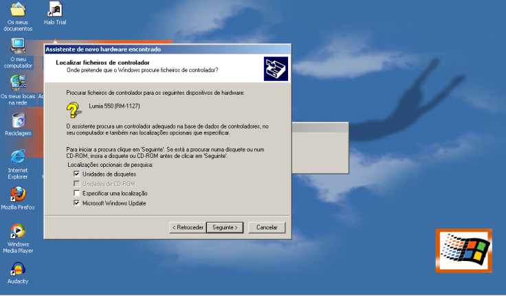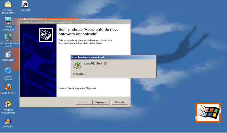 Tal como previa, o Windows não conseguiu instalar o Lumia por falta de drivers.
