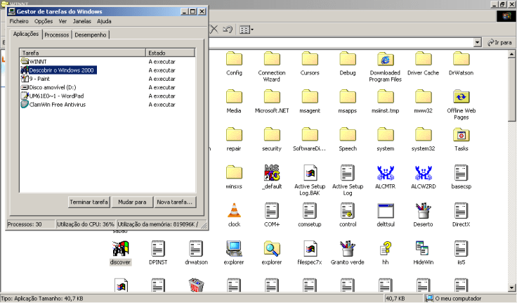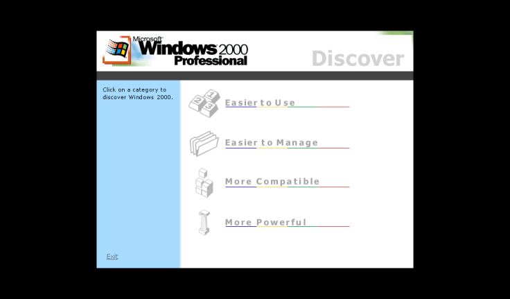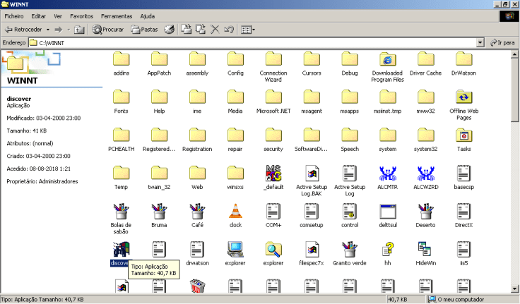 Nas versões do Windows atuais, a raiz do sistema ou %systemroot% é C:\Windows. No Windows 2000, a raiz é C:\WINNT de Windows NT. Curioso, fui ver tudo o que estava nessa pasta e encontrei um ficheiro com o nome discover.exe. Esta aplicação é uma espécie de tutorial para o Windows 2000 que não é mostrada a não ser que a linguagem do sistema esteja em inglês. No entanto, abri o programa que começou um tutorial que explicava as novidades do Windows 2000.