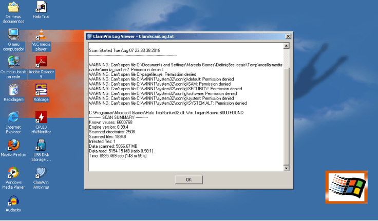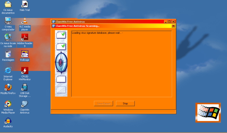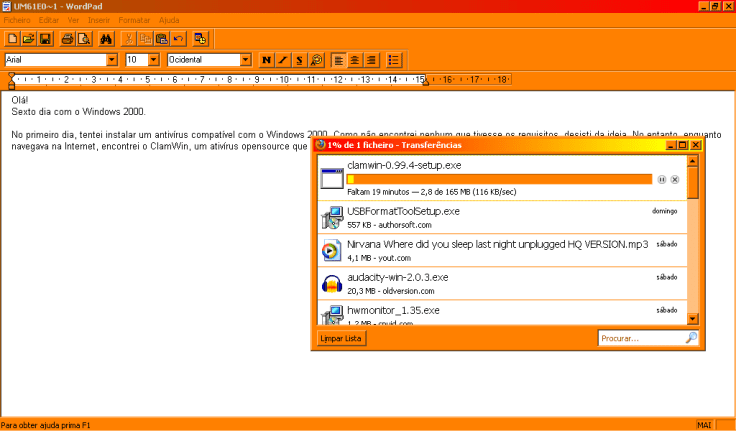 No primeiro dia, tentei instalar um antivírus compatível com o Windows 2000. Como não encontrei nenhum que tivesse os requisitos, desisti da ideia. No entanto, enquanto navegava na Internet, encontrei o ClamWin, um antivírus opensource que funciona em todas as versões do Windows desde o Windows 98.