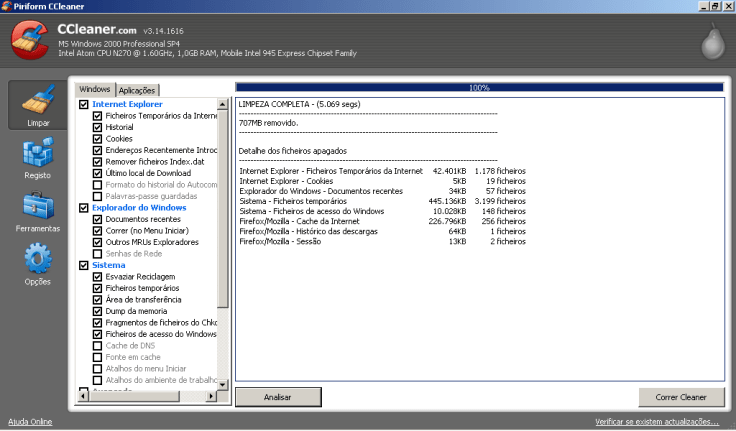 Para terminar o dia, decidi instalar o CCleaner para ajudar a limpar o sistema. Atualmente, recuso-me a usar o programa a partir da versão 8 do Windows porque a Microsoft fez um ótimo trabalho na melhoria de gestão de ficheiros inúteis, mas como estou no ano 2000…
