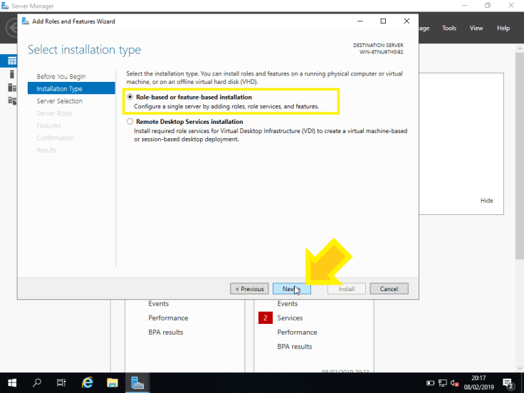 4. Na etapa Select installation type, vamos selecionar Role-based or feature-based installation e clicar em Next >.