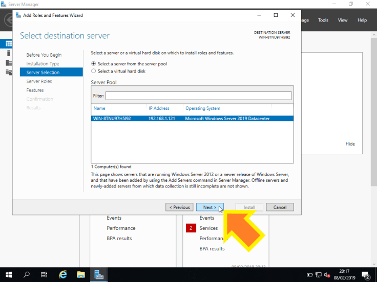5. Agora, temos de selecionar o servidor onde o role vai ser instalado. Neste caso, vamos apenas clicar em Next > já que o nosso servidor é o que está selecionado.
