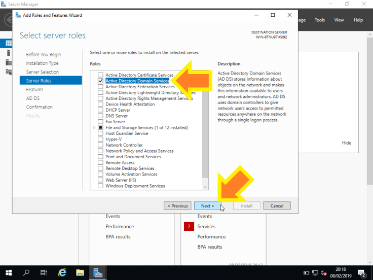 6. Vamos agora escolher o role a instalar. Para criar um domínio, vamos selecionar Active Directory Domain Services e clicar em Next >.