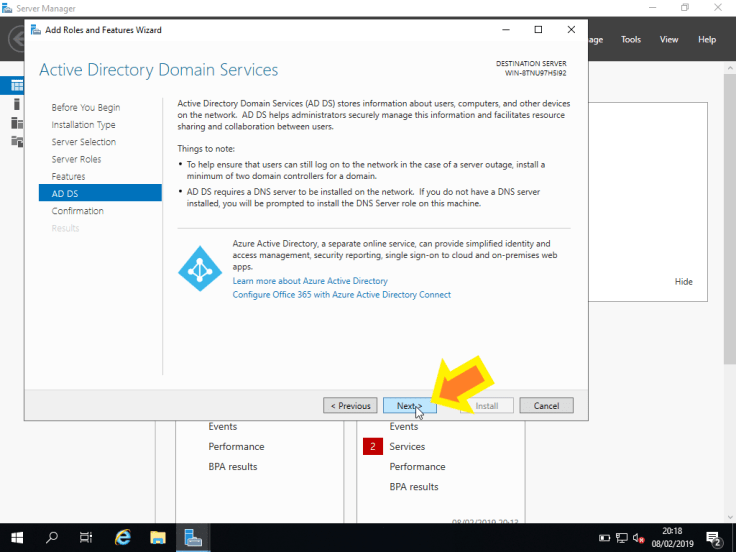 8. Irá ser apresentada alguma informação referente ao Active Directory Domain Services. É importante que a leiam, de modo a perceberem como o Active Directory funciona. Vamos clicar em Next >.