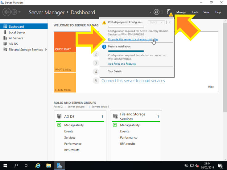 10. Agora, vamos promover o servidor a Domain Controller. Vamos clicar no ícone da bandeira com um aviso e em Promote this server to a domain controller.