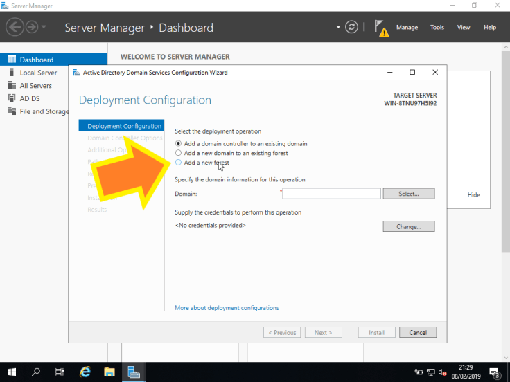 11. Como vamos criar um domínio, vamos selecionar Add a new forest.